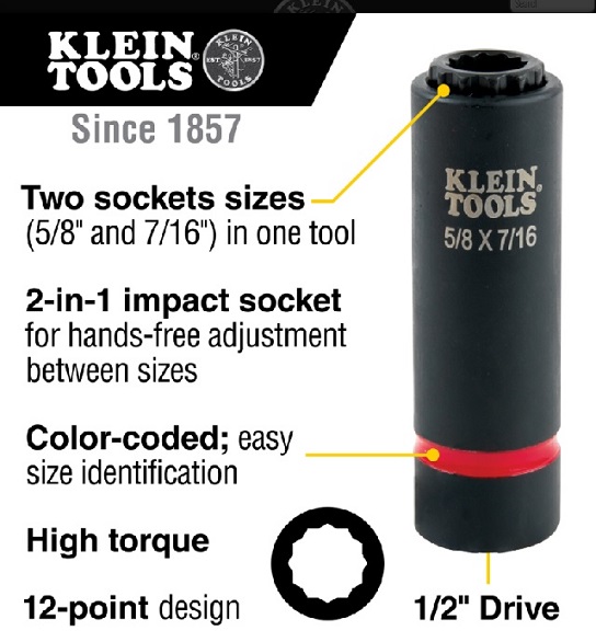 Single-Ended Impact Socket With Hands-Free Adjustment Between Socket Sizes Two Coaxial Spring-Loaded 5/8-Inch And 7/16-Inch Hex Socket Sizes In One Tool Deep Socket With A 1/2-Inch Drive Works Great For Hardware Installation And Removal High-Torque, 12-Point Design Is Easier To Position And Works With Square Fasteners Cross Hole Design To Prevent Unintentional Separation Of Adapter And Socket Engineered For Use With Impact Drivers Including Klein'S 1/2-Inch Compact Impact Wrench (Cat. Nos. Bat20Cw And Bat20Cw1) Great For General Electrical And Construction Work Socket Is Color Coded To Quickly Identify Size