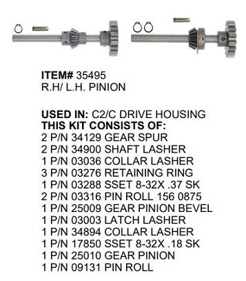 P/N 35495 Kit Shafts Pinion Right & Left C2 Used In: C2/C Drive Housing Kit Includes: 2 P/N 34129 Gear Spur 2 P/N 34900 Shaft Lasher 1 P/N 03036 Collar Lasher 3 P/N 03276 Retaining Ring 1 P/N 03288 Sset 8-32X .37 Sk 2 P/N 03316 Pin Roll 156 0875 1 P/N 25009 Gear Pinion Bevel 1 P/N 03003 Latch Lasher 1 P/N 34894 Collar Lasher 1 P/N 17850 Sset 8-32X .18 Sk 1 P/N 25010 Gear Pinion 1 P/N 09131 Pin Roll Replacement Parts For The C2/C Lashers.