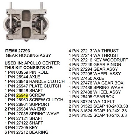 P/N 26949 Screw Part Of Kit # 27293, Gear Housing Assembly Replacement Part For Apollo Lasher 2V* Used In: Apollo Center Kit Includes: 1 P/N 03959 Pin Roll 1 P/N 26944 Axle 1 P/N 26946 Handle Clutch 1 P/N 26947 Plate Clutch 1 P/N 26948 Shaft 2 P/N 26949 Screw 1 P/N 26960 Screw Clutch 1 P/N 26961 Support 2 P/N 26984 Wa End 1 P/N 27088 Spring Wave 1 P/N 27121 Shaft 1 P/N 27122 Shaft 3 P/N 27205 Key 6 P/N 27212 Bearing 4 P/N 27213 Wa Thrust 1 P/N 27214 Wa Thrust 1 P/N 27216 Key Woodruff 4 P/N 27249 Gear Pinion 2 P/N 27294 Gear Assy 1 P/N 27296 Wheel Assy 1 P/N 27450 Axle 1 P/N 27476 Wa Gear Box 1 P/N 27486 Spring Wave 1 P/N 27488 Wheel Assy 1 P/N 28495 Gearbox 3 P/N 30724 Wa 10 Flt 2 P/N 31522 Scap 10-24X0.38 5 P/N 31524 Scap 10-24X .38 2 P/N 31525 Scap 10-24X .63 Replacement Parts For The Apollo Lasher.