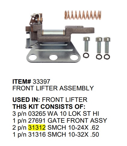 P/N 31312 Smch 10-24X .62 Fi St P Zn Replacement Parts For The Lashers. Part Of The # 33397 Front Lifter Assembly Kit