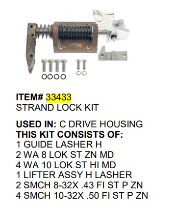 P/N 33433 Strand Lock Kit 03401 Used In: C Drive Housing Kit Includes: 1 P/N 02014 Guide Lasher H 2 P/N 03263 Wa 8 Lok St Zn Md 4 P/N 03265 Wa 10 Lok St Hi Md 1 P/N 03401 Lifter Assy H Lasher 2 P/N 31305 Smch 8-32X .43 Fi St P Zn 4 P/N 31316 Smch 10-32X .50 Fi St P Zn Replacement Parts For The C Lashers.