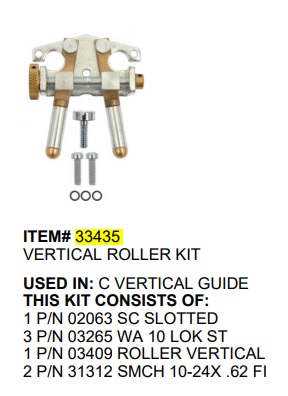 P/N 33435 C Vertical Roller Kit Used In: C Vertical Guide Kit Includes: 1 P/N 02063 Sc Slotted 3 P/N 03265 Wa 10 Lok St 1 P/N 03409 Roller Vertical 2 P/N 31312 Smch 10-24X .62 Fi Replacement Parts For The C Lashers.