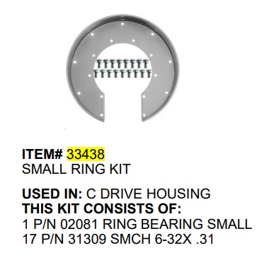 P/N 33438 C Small Ring Kit Used In: C Drive Housing Kit Includes: 1 P/N 02081 Ring Bearing Small 17 P/N 31309 Smch 6-32X .31 Replacement Parts For The C Lashers.