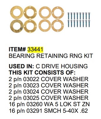 P/N 33441 C- Bearing Retaining Ring Kit Used In: C Drive Housing Kit Includes: 2 P/N 03022 Cover Washer 2 P/N 03023 Cover Washer 2 P/N 03024 Cover Washer 2 P/N 03025 Cover Washer 16 P/N 03260 Wa 5 Lok St Zn 16 P/N 03291 Smch 5-40X .62 Replacement Parts For The C Lashers.