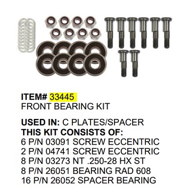 P/N 33445 C - Front Bearing Kit Used In: C Plates/Spacer Kit Includes: 6 P/N 03091 Screw Eccentric 2 P/N 04741 Screw Eccentric 8 P/N 03273 Nt .250-28 Hx St 8 P/N 26051 Bearing Rad 608 16 P/N 26052 Spacer Bearing Replacement Parts For The C Lashers.