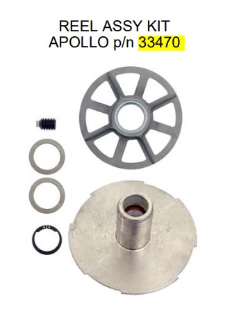 P/N 33470 Reel Assembly Kit Used In: Apollo Center Kit Includes: 1 P/N 16175 Ring Retaining 2 P/N 26957 Spacer Reel 1 P/N 27127 Reel Asembly 1 P/N 27520 Sset 1/4-20X5/16 1 P/N 31564 Cover Reel Replacement Parts For The Apollo Lashers.