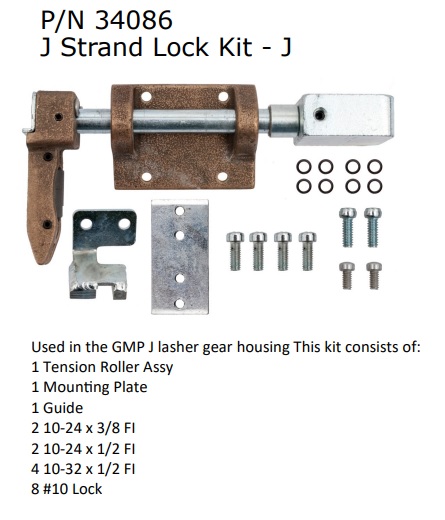 P/N 34086 J Strand Lock Kit - J Used In: J Lasher Gear Housing. Kit Includes: 1 Tension Roller Assy 1 Mounting Plate 1 Guide 2 10-24 X 3/8 Fi 2 10-24 X 1/2 Fi 4 10-32 X 1/2 Fi 8 #10 Lock Replacement Parts For The J Lashers.