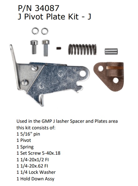 P/N 34087 J Pivot Plate Kit - J Used In: J Lasher Spacer And Plates Area. Kit Includes: 1 5/16" Pin 1 Pivot 1 Spring 1 Set Screw 5-40X.18 1 1/4-20X1/2 Fi 1 1/4-20X.62 Fi 1 1/4 Lock Washer 1 Hold Down Assy Replacement Part For The J Lasher.