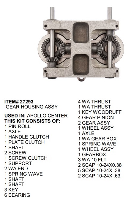 P/N 27293 Gear Housing Assembly For Apollo Lasher. Used In: Apollo Center Must Buy Kit # 27293. This Kit Contains The Following: 1 Pin Roll 1 Axle 1 Handle Clutch 1 Plate Clutch 1 Shaft 2 Screw 1 Screw Clutch 1 Support 2 Wa End 1 Spring Wave 1 Shaft 1 Shaft 3 Key 6 Bearing 4 Wa Thrust 1 Wa Thrust 1 Key Woodruff 4 Gear Pinion 2 Gear Assy 1 Wheel Assy 1 Axle 1 Wa Gear Box 1 Spring Wave 1 Wheel Assy 1 Gearbox 3 Wa 10 Flt 2 Scap 10-24X0.38 5 Scap 10-24X .38 2 Scap 10-24X .63 Replacement Parts For The Apollo Lasher.