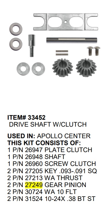 Item# 33452 Drive Shaft W/Clutch Used In: Apollo Center This Kit Consists Of: 1 P/N 26947 Plate Clutch 1 P/N 26948 Shaft 1 P/N 26960 Screw Clutch 2 P/N 27205 Key .093-.091 Sq 2 P/N 27213 Wa Thrust 2 P/N 27249 Gear Pinion 2 P/N 30724 Wa 10 Flt 2 P/N 31524 10-24X .38 Bt St