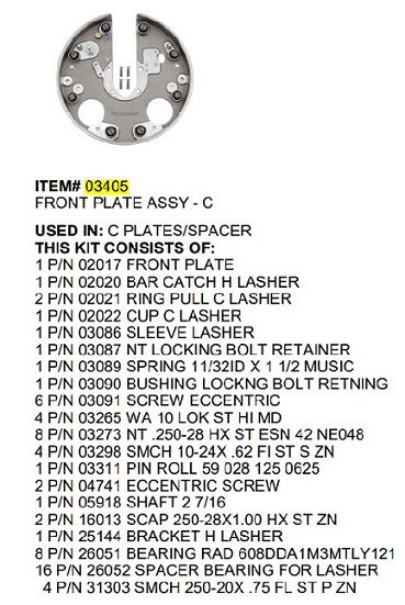 Used In: C Plates/Spacer This Kit Consists Of: 1 P/N 02017 Front Plate 1 P/N 02020 Bar Catch H Lasher 2 P/N 02021 Ring Pull C Lasher 1 P/N 02022 Cup C Lasher 1 P/N 03086 Sleeve Lasher 1 P/N 03087 Nt Locking Bolt Retainer 1 P/N 03089 Spring 11/32Id X 1 1/2 Music 1 P/N 03090 Bushing Lockng Bolt Retning 6 P/N 03091 Screw Eccentric 4 P/N 03265 Wa 10 Lok St Hi Md 8 P/N 03273 Nt .250-28 Hx St Esn 42 Ne048 4 P/N 03298 Smch 10-24X .62 Fi St S Zn 1 P/N 03311 Pin Roll 59 028 125 0625 2 P/N 04741 Eccentric Screw 1 P/N 05918 Shaft 2 7/16 2 P/N 16013 Scap 250-28X1.00 Hx St Zn 1 P/N 25144 Bracket H Lasher 8 P/N 26051 Bearing Rad 608Dda1M3Mtly121 16 P/N 26052 Spacer Bearing For Lasher 4 P/N 31303 Smch 250-20X .75 Fl St P Zn