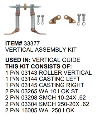 P/N 03160 Stud 3/8D - J2 Part Of L.H./R..H. Vertical Sub Assemblies Must Buy Kit # 33377, Vertical Assembly Kit Kit # 33377 Includes: 1 P/N 03143 Roller Vertical 1 P/N 03144 Casting Left 1 P/N 03145 Casting Right 2 P/N 03265 Wa 10 Lok St 2 P/N 03298 Smch 10-24X .62 2 P/N 03304 Smch 250-20X .62 2 P/N 16005 Wa .250 Lok Replacement Part For The J2 Lashers.
