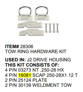 P/N 16081 Bolt For Towing Eye Scap 250-28X1.12 T 4/Set Must Buy Kit # 28306, Tow Ring Hardware Kit Used In: J2 Drive Housing Kit Includes: 4 P/N 03273 Nt .250-28 Hx 4 P/N 16081 Scap 250-28X1.12 T 2 P/N 25124 Plate 2 P/N 30139 Weldment Tow Replacement Parts For J2 Lashers.