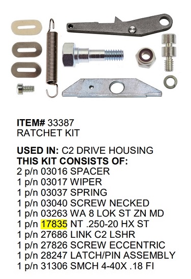 P/N 17835 C2 Lasher Ratchet Pawl Eccentric Nut Must Buy P/N 33387 Ratchet Kit Used In: C2 Drive Housing Kit Includes: P/N 03016 Spacer (2) P/N 03017 Wiper (1) P/N 03037 Spring (1) P/N 03040 Sscrew Necked (1) P/N 03263 Wa 8 Lok St Zn Md (1) P/N 17835 Nt .250-20 Hx St (1) P/N 27686 Link C2 Lshr (1) P/N 27826 Screw Eccentric (1) P/N 28247 Latch/Pin Assembly (1) P/N 31306 Smch 4-40X .18 Fi (1)